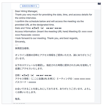 候補者に対しての面談や選考結果の連絡ツールとして、独自のメッセージ機能が搭載されています。さらに、日本語が伝わらなかった時にも安心の自動翻訳が付いており、英語や中国などの多言語に対応しています。外国語が話せなくても全て自動翻訳されるので、安心して採用活動を行えます。