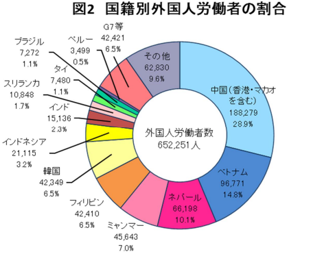 中国が全体の28.9%(188,279人)で最多、次いでベトナム(14.8%)、ネパール(10.1%)となっています。