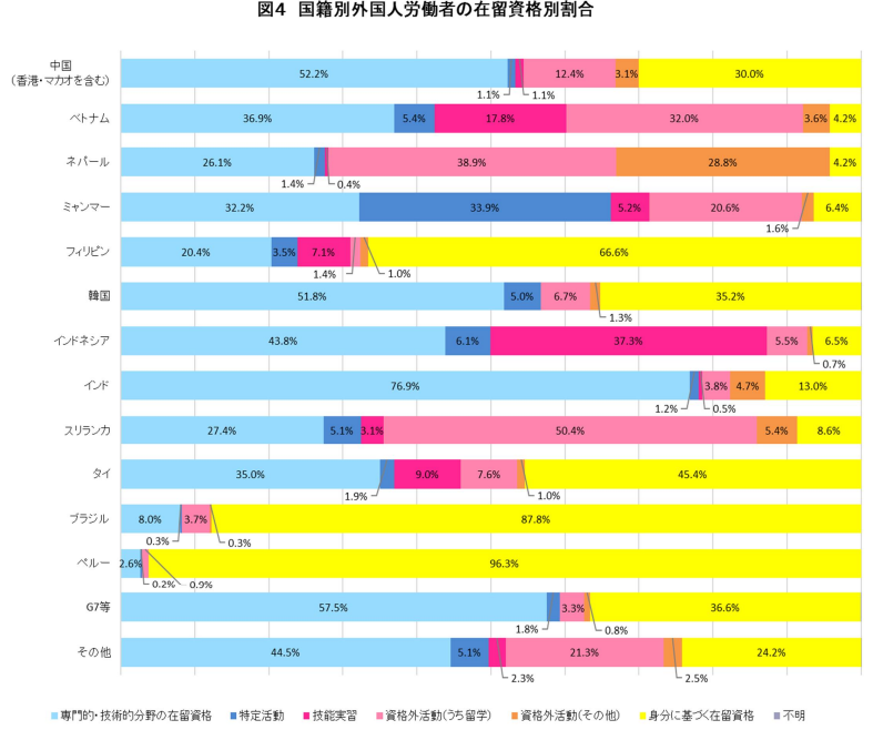 中国人労働者については、多くが専門的・技術的分野の在留資格を持っており、一方でフィリピンやブラジル、ペルーなどの国籍では身分に基づく在留資格を持つ労働者が多い傾向が見られます。