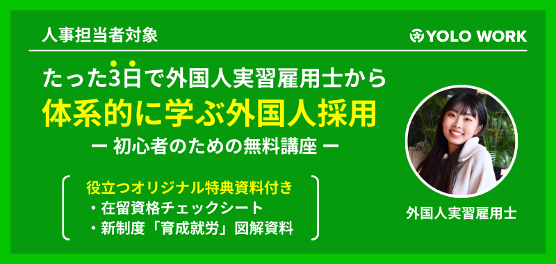 たった3日であなたも外国人採用マスター(5秒で登録できます) たった3日で必ず学べる内容(特典資料付き) 外国人採用に必要な「在留資格」 外国人「採用」と「定着」のポイント 外国人を採用する方法※全て無料で学ぶことができます © YOLO JAPAN CORPORATION.