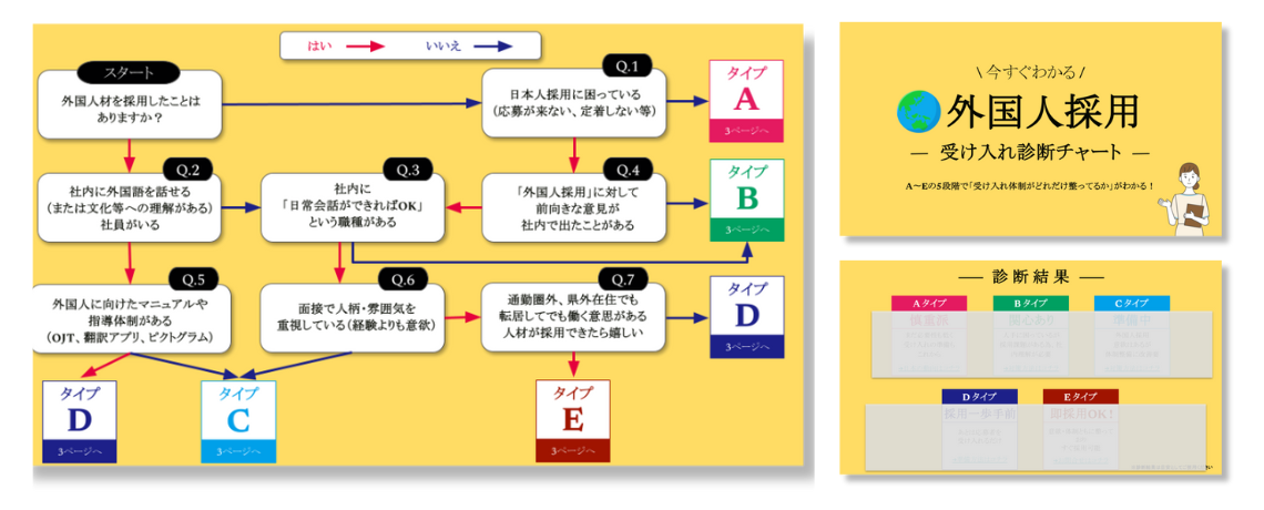 【15秒で完了】外国人採用 -受け入れ診断チャート-(診断結果付き) 診断チャートでわかること<無料> 外国人材を問題なく受け入れられるか? 5段階でわかる診断結果 今後どのような対策をすれば良いかのヒント © YOLO JAPAN CORPORATION.